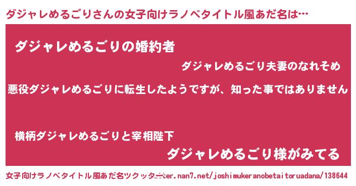 | 男性向けラノベタイトル風あだ名 | 『この素晴らしい世界にダジャレめるごりを!』 |