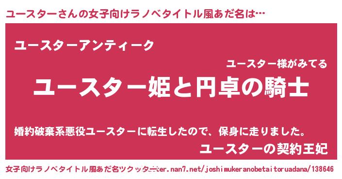 ユースターさんの女子向けラノベタイトル風あだ名は… 『ユースター姫と円卓の騎士』『ユースターアンティーク』『ユースターの契約王妃』 ツクッター #女子向けラノベタイトル風あだ名ツクッター http://tkutter.nan7.net/joshimukeranobetaitoruadana/138646/