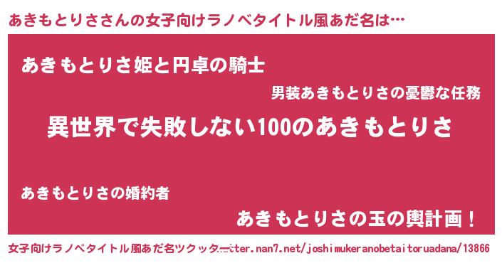 | 男性向けラノベタイトル風あだ名 | 『あきもとりさという概念が存在しない退屈な世界 』 |
