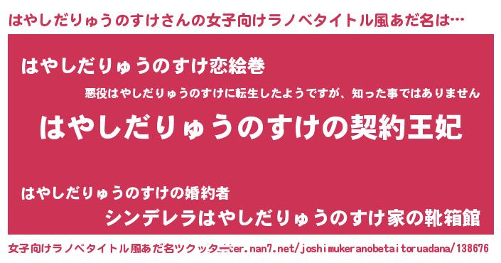 | 男性向けラノベタイトル風あだ名 | 『誰もが恐れるあのはやしだりゅうのすけが、ぼくの専属メイドになるようです。』 |