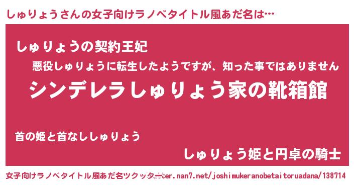 | 胡散臭い通販商品みたいなあだ名 | 『絶対に幸福をもたらす水素水…その名も「しゅりょう」』 |