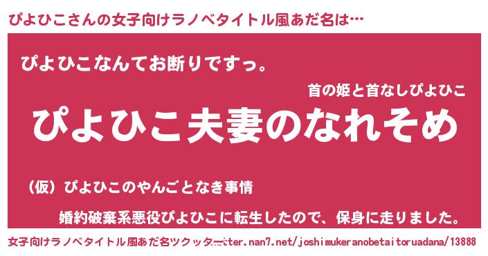| 男性向けラノベタイトル風あだ名 | 『おまえをオタクにしてやるから、俺をぴよひこにしてくれ! 』 |