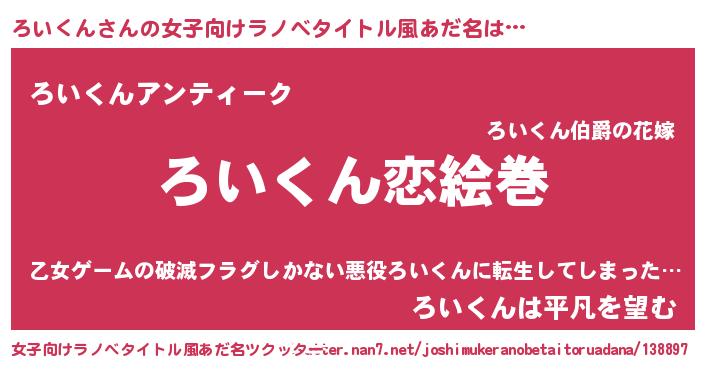| 男性向けラノベタイトル風あだ名 | 『おまえをオタクにしてやるから、俺をろいくんにしてくれ! 』 |