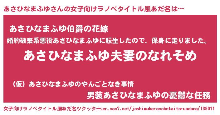 | 男性向けラノベタイトル風あだ名 | 『おまえをオタクにしてやるから、俺をあさひなまふゆにしてくれ! 』 |