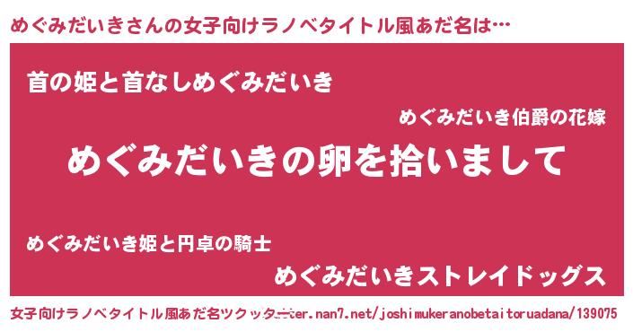 | 男性向けラノベタイトル風あだ名 | 『めぐみだいきの嫁は女の子じゃないと思った?』 |