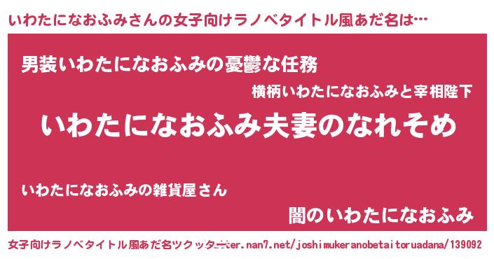 | 男性向けラノベタイトル風あだ名 | 『おまえをオタクにしてやるから、俺をいわたになおふみにしてくれ! 』 |