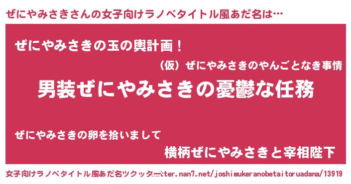 ぜにやみさきさんの女子向けラノベタイトル風あだ名は… 『男装ぜにやみさきの憂鬱な任務』『ぜにやみさきの玉の輿計画!』『横柄ぜにやみさきと宰相陛下』 ツクッター #女子向けラノベタイトル風あだ名ツクッター http://tkutter.nan7.net/joshimukeranobetaitoruadana/13919/