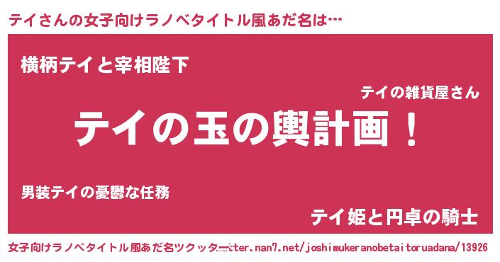 | 男性向けラノベタイトル風あだ名 | 『テイ~年齢イコール彼女いない歴の魔法使い~』 |