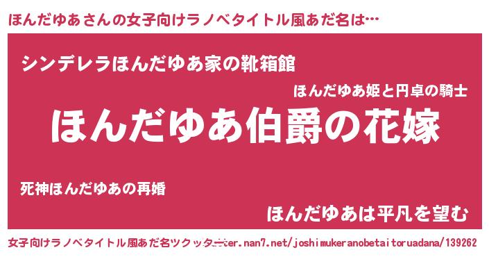 | 男性向けラノベタイトル風あだ名 | 『うちの娘の為ならば、俺はもしかしたらほんだゆあも倒せるかもしれない。』 |