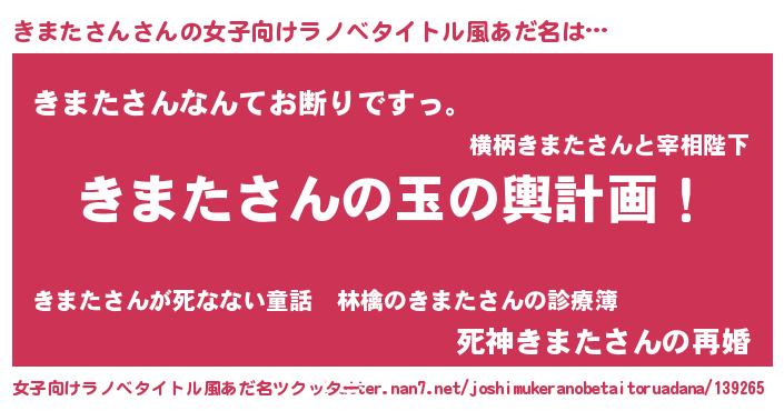 | 男性向けラノベタイトル風あだ名 | 『きまたさん~年齢イコール彼女いない歴の魔法使い~』 |