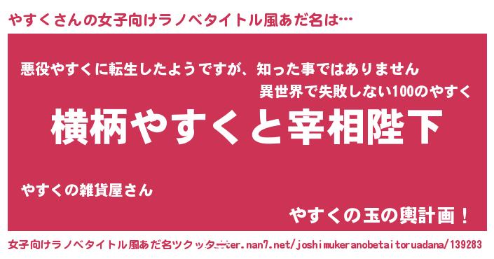 | 男性向けラノベタイトル風あだ名 | 『やすくに滅ぼされるだけの簡単なお仕事です』 |