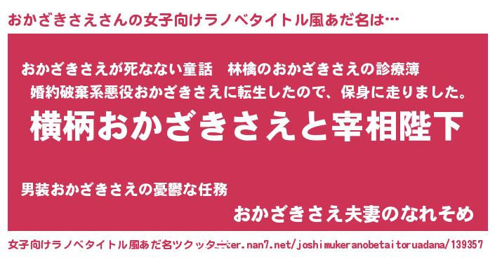 | 男性向けラノベタイトル風あだ名 | 『おかざきさえに滅ぼされるだけの簡単なお仕事です』 |