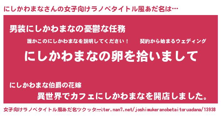 にしかわまなさんの女子向けラノベタイトル風あだ名は… 『にしかわまなの卵を拾いまして』『男装にしかわまなの憂鬱な任務』『異世界でカフェにしかわまなを開店しました。』 ツクッター #女子向けラノベタイトル風あだ名ツクッター http://tkutter.nan7.net/joshimukeranobetaitoruadana/13938/