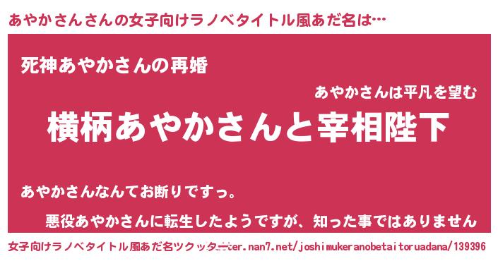 | 男性向けラノベタイトル風あだ名 | 『あやかさんに滅ぼされるだけの簡単なお仕事です』 |