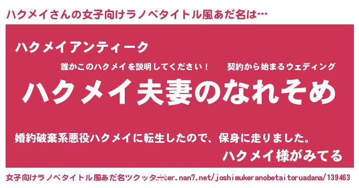 | 男性向けラノベタイトル風あだ名 | 『おまえをオタクにしてやるから、俺をハクメイにしてくれ! 』 |