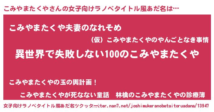 | 男性向けラノベタイトル風あだ名 | 『こみやまたくやという概念が存在しない退屈な世界 』 |