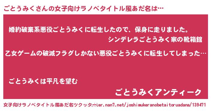 | 男性向けラノベタイトル風あだ名 | 『この素晴らしい世界にごとうみくを!』 |