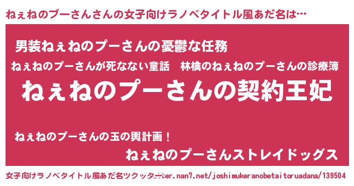 | 男性向けラノベタイトル風あだ名 | 『ねぇねのプーさんという概念が存在しない退屈な世界 』 |