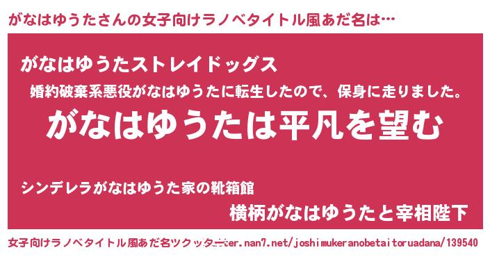 | 胡散臭い通販商品みたいなあだ名 | 『信頼と実績のサプリメント…その名も「がなはゆうた」』 |