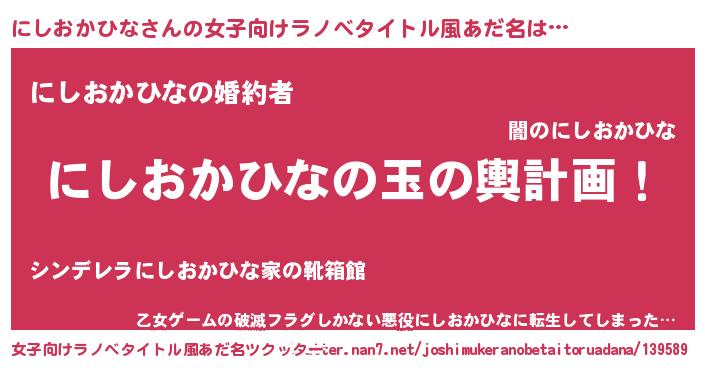 | 男性向けラノベタイトル風あだ名 | 『にしおかひな~年齢イコール彼女いない歴の魔法使い~』 |