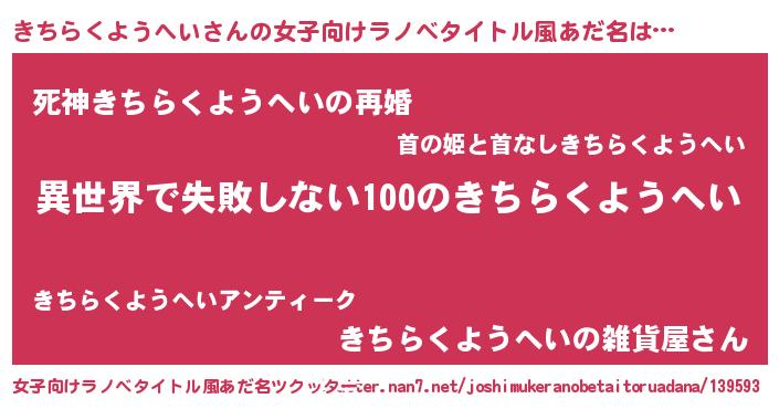 | 男性向けラノベタイトル風あだ名 | 『きちらくようへいという概念が存在しない退屈な世界 』 |