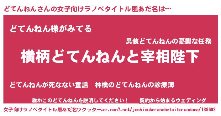 | 男性向けラノベタイトル風あだ名 | 『どてんねんに滅ぼされるだけの簡単なお仕事です』 |