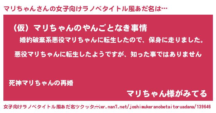 | 男性向けラノベタイトル風あだ名 | 『この素晴らしい世界にマリちゃんを!』 |