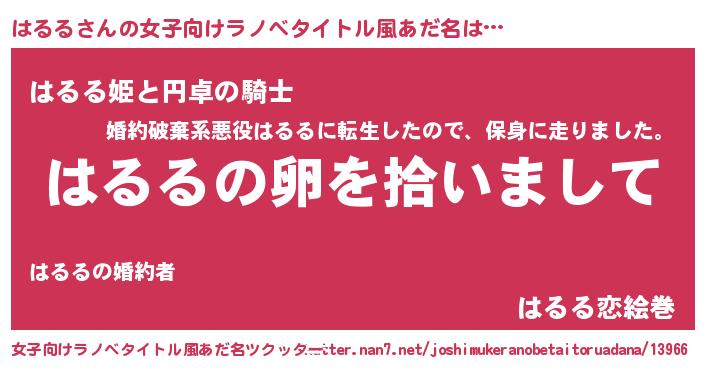 | 男性向けラノベタイトル風あだ名 | 『はるるの嫁は女の子じゃないと思った?』 |