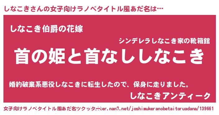 | 男性向けラノベタイトル風あだ名 | 『はたらくしなこきさま!』 |