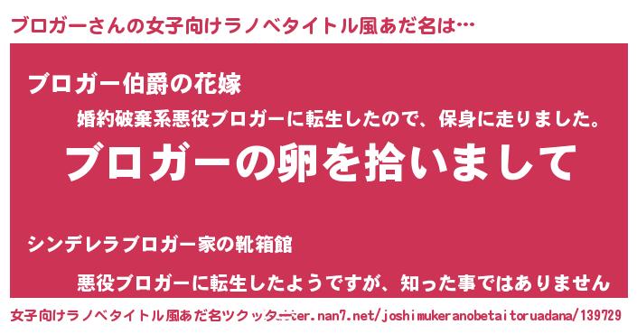 | 男性向けラノベタイトル風あだ名 | 『ブロガーの嫁は女の子じゃないと思った?』 |