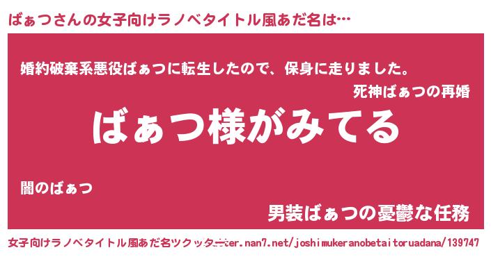 | 男性向けラノベタイトル風あだ名 | 『ばぁつの嫁は女の子じゃないと思った?』 |
