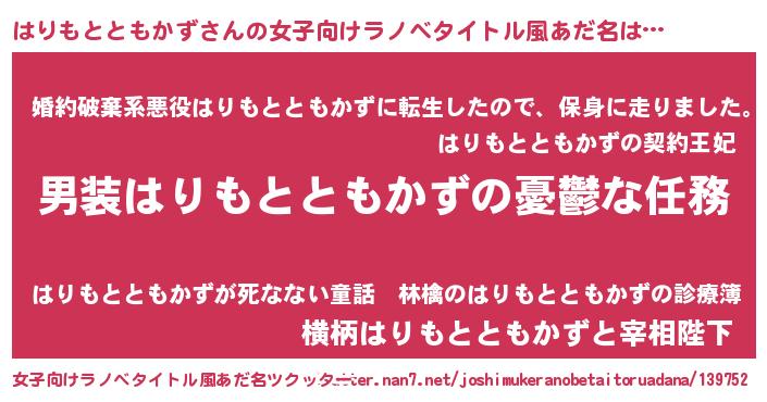 | 男性向けラノベタイトル風あだ名 | 『うちのはりもとともかずが世界を掌握している!』 |