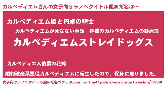 | 男性向けラノベタイトル風あだ名 | 『Re:カルペディエムから始める異世界生活』 |