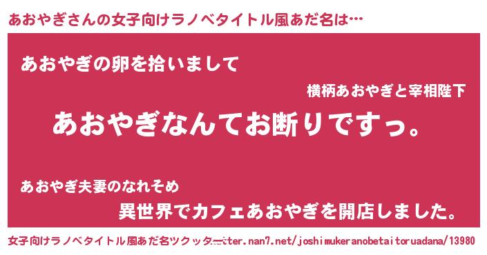 | 肩書あだ名 | 『あおやぎ総統』『あおやぎ団長』 |