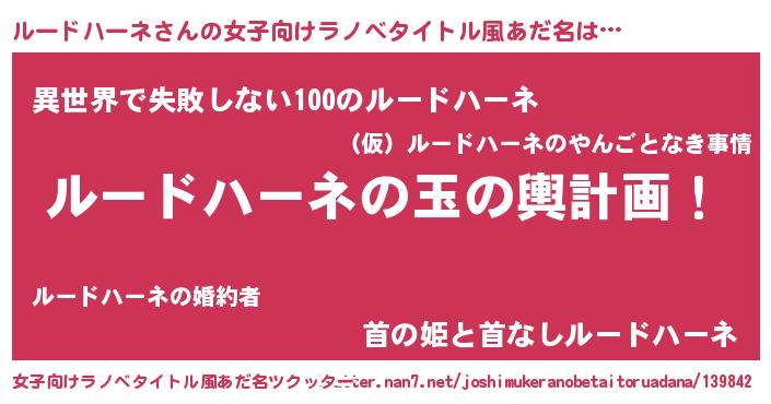 | 男性向けラノベタイトル風あだ名 | 『転生したらルードハーネだった件』 |
