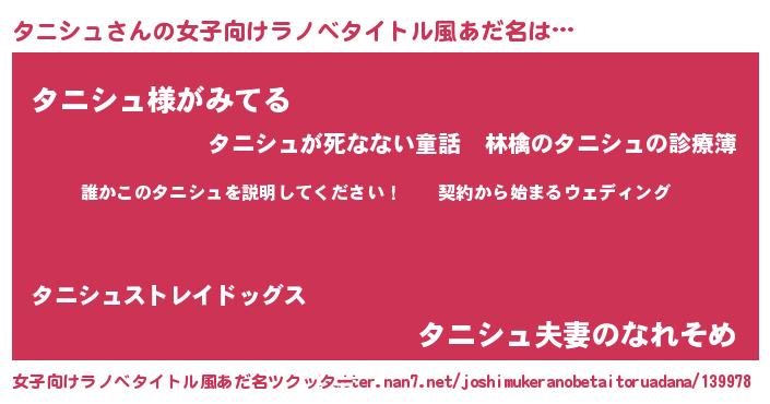 | 男性向けラノベタイトル風あだ名 | 『タニシュアートオンライン』 |