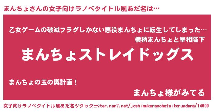 | 男性向けラノベタイトル風あだ名 | 『Re:まんちょから始める異世界生活』 |