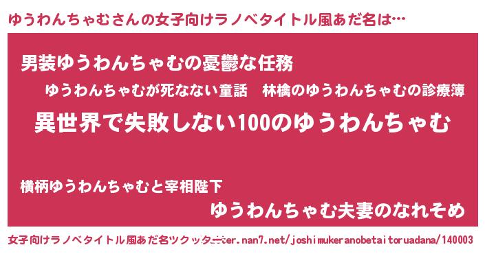 | 男性向けラノベタイトル風あだ名 | 『ゆうわんちゃむという概念が存在しない退屈な世界 』 |