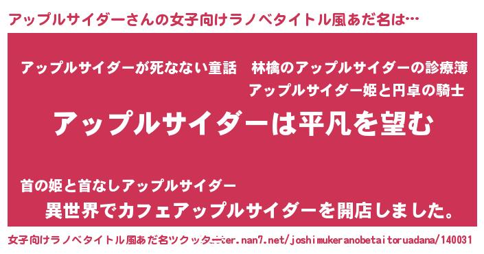 | 男性向けラノベタイトル風あだ名 | 『ダンジョンにアップルサイダーを求めるのは間違っているだろうか』 |