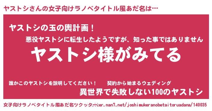 | 男性向けラノベタイトル風あだ名 | 『ヤストシの嫁は女の子じゃないと思った?』 |