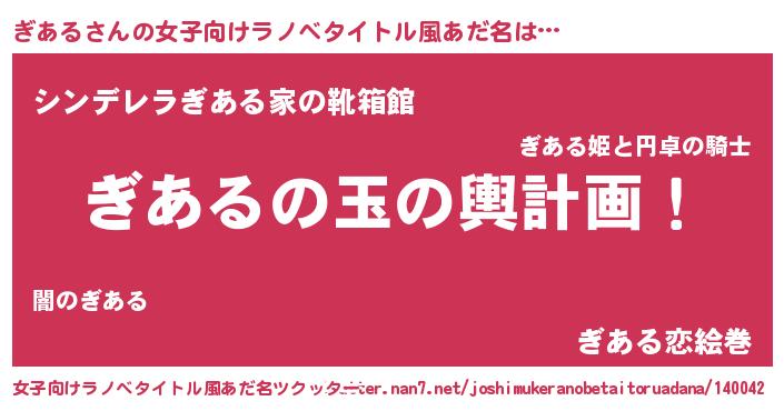 | 男性向けラノベタイトル風あだ名 | 『ぎある~年齢イコール彼女いない歴の魔法使い~』 |