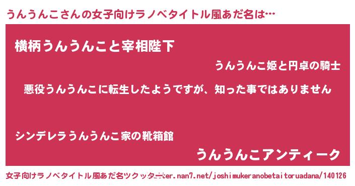 | 男性向けラノベタイトル風あだ名 | 『この素晴らしい世界にうんうんこを!』 |