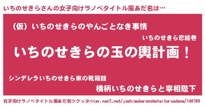 | 男性向けラノベタイトル風あだ名 | 『いちのせきら~年齢イコール彼女いない歴の魔法使い~』 |