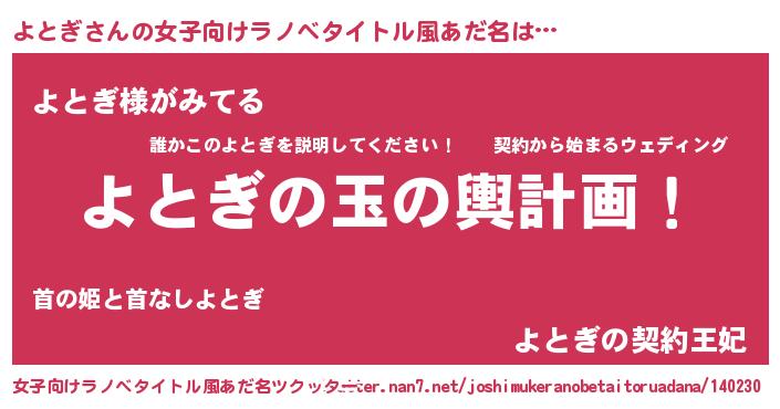 | 意味不明あだ名 | 『もやし科よとぎ属』『永久保存よとぎ』 |