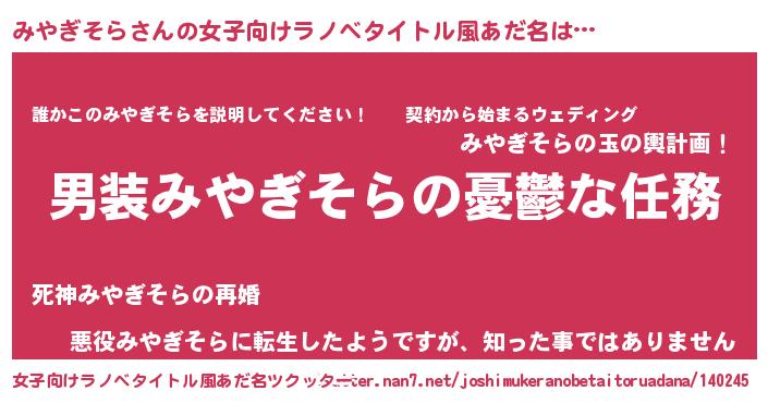 | 男性向けラノベタイトル風あだ名 | 『うちのみやぎそらが世界を掌握している!』 |