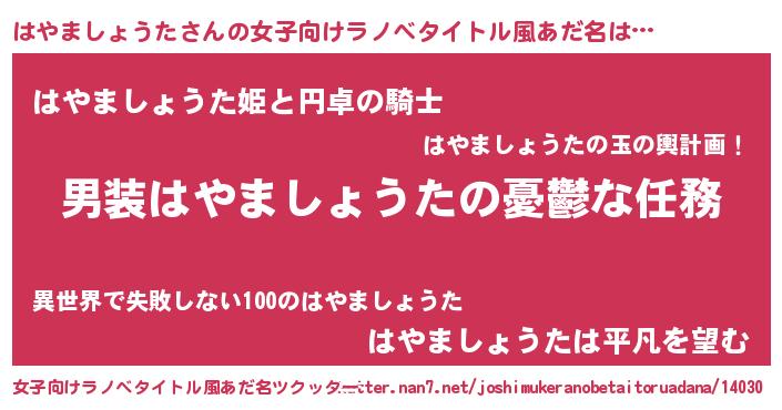 | 男性向けラノベタイトル風あだ名 | 『冴えないはやましょうたの育てかた』 |