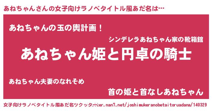 | 男性向けラノベタイトル風あだ名 | 『アネチャンアートオンライン』 |