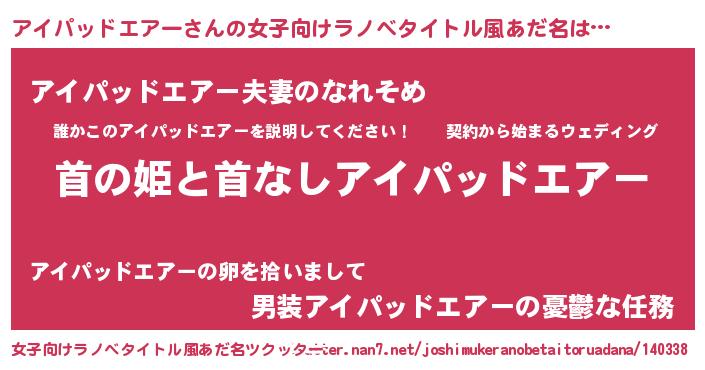 アイパッドエアーさんの女子向けラノベタイトル風あだ名は… 『首の姫と首なしアイパッドエアー』『アイパッドエアー夫妻のなれそめ』『男装アイパッドエアーの憂鬱な任務』 ツクッター #女子向けラノベタイトル風あだ名ツクッター http://tkutter.nan7.net/joshimukeranobetaitoruadana/140338/