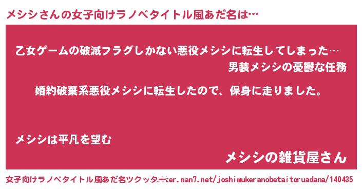 | 男性向けラノベタイトル風あだ名 | 『メシシスレイヤー』『魔弾の王とメシシ』 |