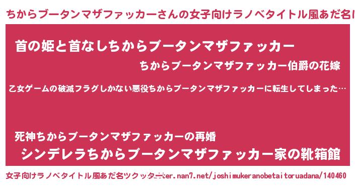 | 男性向けラノベタイトル風あだ名 | 『魔弾の王とちからブータンマザファッカー』 |